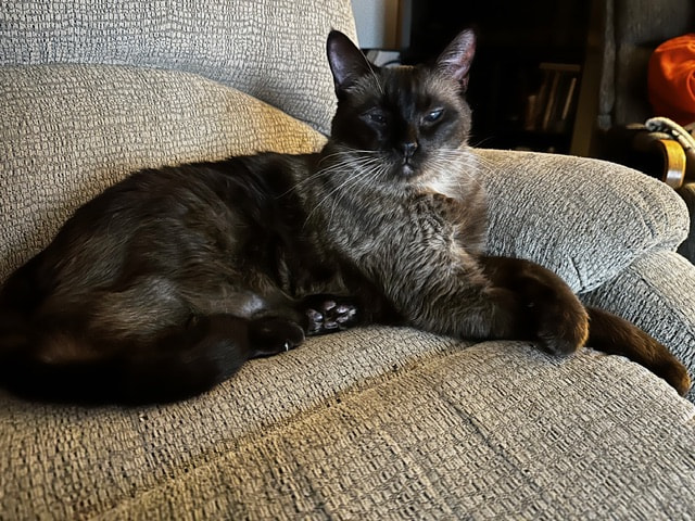 Senior reading buddy, Jasper, 16 years old, diabetic, 18 pounds, master of his domain (which is mostly the couch, but still).