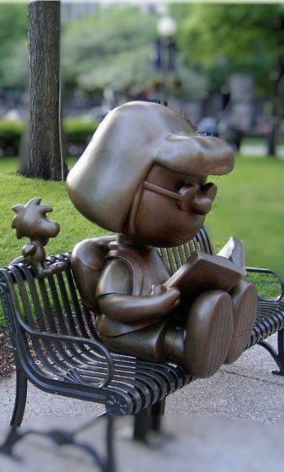 " A bronze sculpture of Marcie reading a book on a park bench, accompanied by Woodstock perched beside her, is located outside the Central Santa Rosa Library in California. This statue is part of the Peanuts on Parade public art projects honoring Charles M. Schulz, often featuring the studious, quirky character enjoying a book. It was created by TivoliToo, Inc., a Minnesota-based company that holds the license to create Peanuts sculptures."